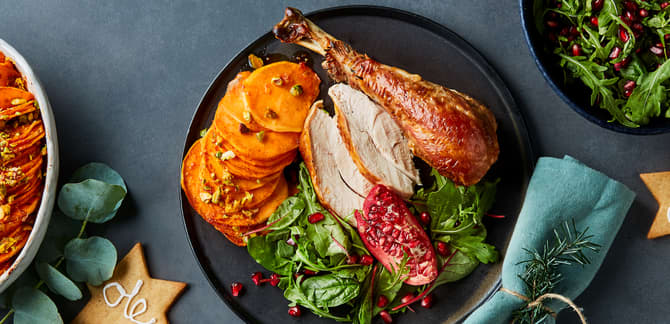 Tradisjonelt tilbehør til en norsk nyttårs- eller festmiddag med kalkun er gjerne brun saus, kokte poteter og waldorfsalat, men kalkun passer egentlig med det aller meste. Prøv med ovnsbakte grønnsaker, bønner, rosenkål eller andre grønnsaker du liker godt.